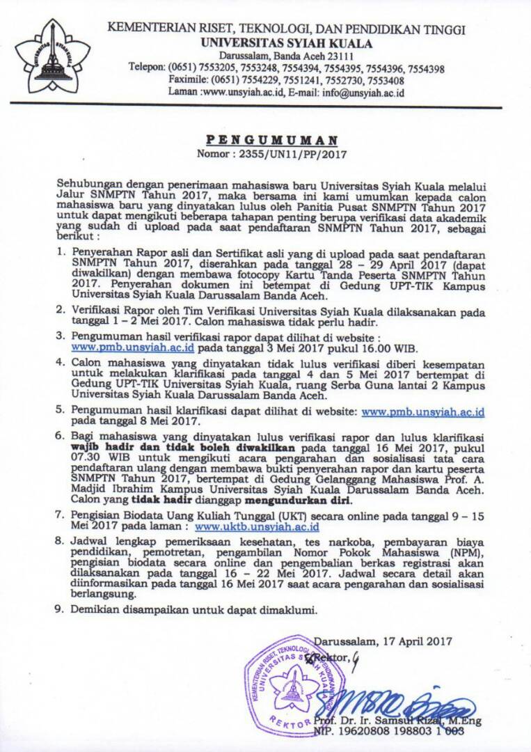 Sehubungan dengan penerimaan mahasiswa baru Universitas Syiah Kuala melalui Jalur SNMPTN Tahun 2017, maka bersama ini kami umumkan kepada calon mahasiswa baru yang dinyatakan lulus oleh Panitia Pusat SNMPTN Tahun 2017 untuk dapat mengikuti tahapan penting berupa verifikasi data akademik yang sudah di upload pada saat pendaftaran SNMPTN Tahun 2017.