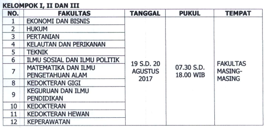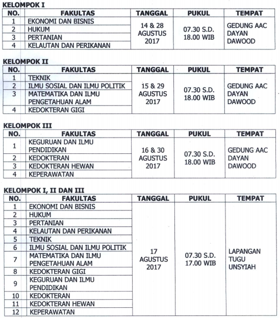 Senin, 24 Juli 2017 11605 kali dibacaRektor Universitas Syiah Kuala dengan ini mengumumkan kepada seluruh mahasiswa baru Universitas Syiah Kuala Tahun Akademik 2017/2018, agar hadir mengikuti kegiatan PAKARMARU sebagaimana jadwal berikut:Bagikan Pengumuman iniPengumuman LainnyaHasil Verifikasi Data Akademik Calon Mahasiswa Baru Jalur SNBP Universitas Syiah Kuala Tahun 2024Perpanjangan Penerimaan Mahasiswa Baru Program Studi Magister Administrasi Pendidikan (MAP) dan Program Studi Magister Pendidikan IPA (MPIPA) Semester Genap T.A. 2023/2024Penerimaan Calon Mahasiswa Baru Program Studi di Luar Kampus Utama (PSDKU)Hasil Seleksi Calon Mahasiswa Baru Program D-III Reguler/AfirmasiPenerimaan Mahasiswa Baru Program Diploma Tiga (D-III) Reguler/Afirmasi USK Tahun 2022Penerimaan Mahasiswa Baru Melalui Seleksi Talenta Universitas Syiah Kuala Berprestasi Tahun 2022Pengumuman Penerimaan Mahasiswa Baru Program PascasarjanaPerpanjangan Verifikasi dan Klarifikasi Berkas Akademik SNMPTN 2020Hasil Lulus Seleksi SNMPTN 2020 Universitas Syiah KualaVerifikasi Data Akademik Bagi Calon Mahasiswa yang Lulus Seleksi SNMPTN 2020